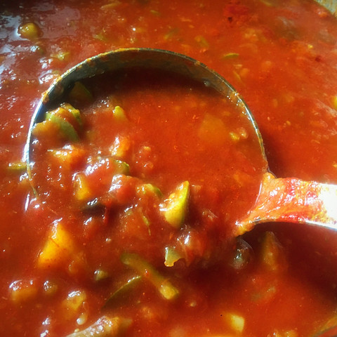 Quando le verdure sono cotte le passo con l'estrattore o con un passaverdura, rimetto sul fuoco a concentrare e aggiungo l'aceto filtrato e un bel cucchiaio di zucchero. Controllo il sale, un pizzico di pepe e quando raggiunge la consistenza giusta, imbottiglio in bottiglie piccole che pastorizzo per venti minuti.